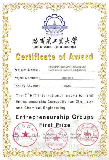 近日,由中国复合材料学会和哈尔滨工业大学国际合作部主办的哈尔滨工业大学第二届国际化学化工创新创业大赛举办。我校yl6776永利集团2017级硕士研究生李季阳、毕艳妮获得创业组一等奖。