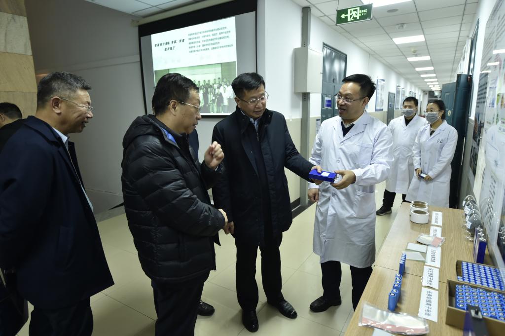 在动力电池国家地方联合工程实验室,谢海明介绍了固态电池协同创新平台组建、国际合作研究与开发、与企业合作推进项目进展等情况。安立佳高度赞扬了我校固态电池研究的前瞻性,亲切询问了团队建设和项目进展情况,饶有兴致地参观了“固态电池”等模型。