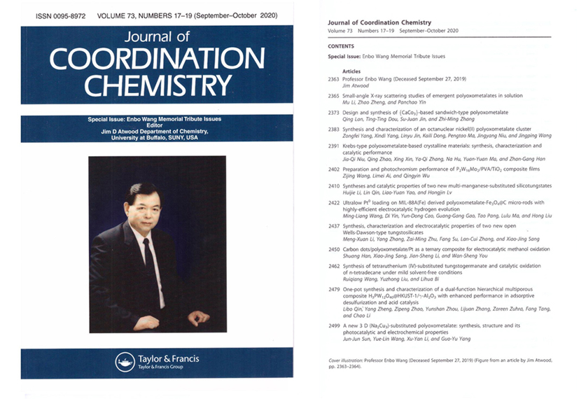 这期专刊是由《配位化学》杂志主编Jim D Atwood教授组织编写,南京大学孙为银教授、我校李阳光教授和陈维林教授协助完成,该专刊邀请了王恩波先生的国内外同事、学生发表他们在以多酸为主的研究领域中的最新科研成果,集结成刊《Special Issue: Enbo Wang Memorial Tribute Issues》,以此表达对王恩波先生的深切怀念。