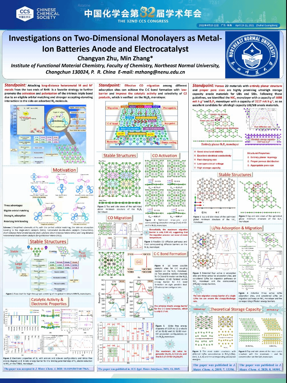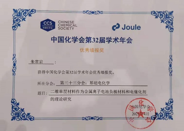 yl6776永利集团2019级博士研究生朱常岩投递在第33分会场“基础电化学”,主题为“二维单层材料作为金属离子电池负极材料和电催化剂的理论研究”的墙报被评为大会优秀墙报。