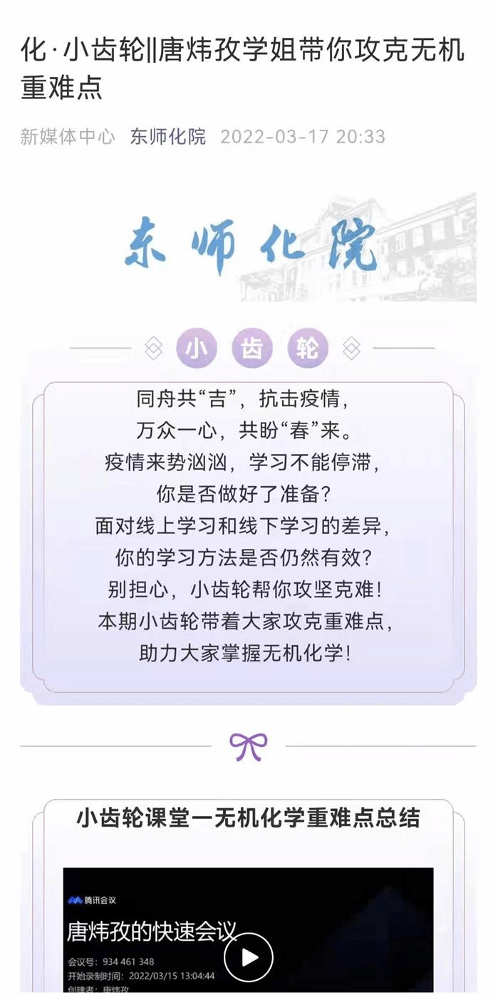 聚焦需求,促学促健。为解决好疫情防控期间学生的突发性、紧迫性、临时性学习和生活问题。学院第一时间启动线上教学系统、欧倍尔虚拟仿真云平台,保障学生的学习及实验需求。邢双喜老师创新课堂教学,以腾讯会议为主要教学直播平台,结合QQ群、问卷星、BB平台等,保障与学生互动答疑的需要。学院团委“静中有动”,持续推出网络“小齿轮课堂”,号召学生疫情期间不忘学习根本,让优秀的学生以第一视角为同学答疑解惑,帮助学生解决学业难题。学工组成员带领党员突击队深入寝室管理群,汇集整理各项突发问题,以“第一时间”解决为准则争取将全部问题消化在学院层面,全面保障学生的学习生活平稳有序。