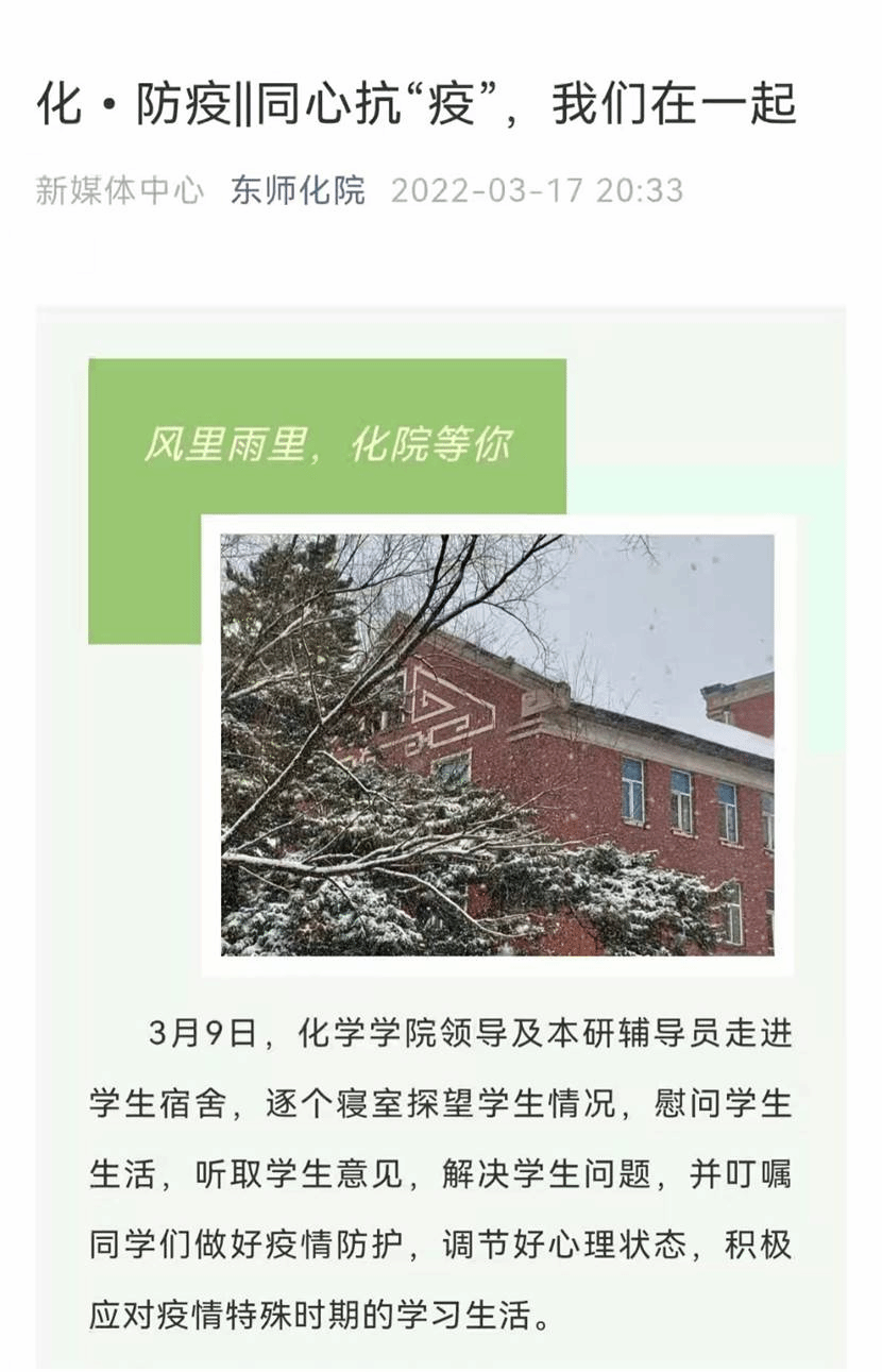 陪伴守护,合力育人。在学校进入静态管理后,学院向全体党员和教师发出倡议,号召大家投身到教书育人、关怀关爱和疫情防控工作。班子成员定期和在校内外隔离的学生沟通联系关心关爱,任课教师以课堂为阵地引导学生正确认识疫情、坚定胜利信念,各位研究生导师进一步担起“第一责任人”职责,通过电话联系和网络交流每日关心关注在校学生,通过为隔离学生手写加油寄语,自发为学生录制抗疫慰问视频,不断充实学生的内心力量。学院学工组时刻关注学生思想动态和心理状况,高度重视就业困难、学业困难、家庭困难学生群体,关心隔离学生情况,进行“一对一”就业指导,学业结对帮扶,临时困难补助,隔离物资筹备。学院公众号启动“化·防疫”系列主题活动,发挥网络思政优势,把根据不同时间节点向全院学生推送防疫信息,引领学生科学防疫,共克时艰。学生家长陆续发来对学生的鼓励信息、视频和对学校的感谢信,家校携手为学生打气加油,守护学生身心健康。