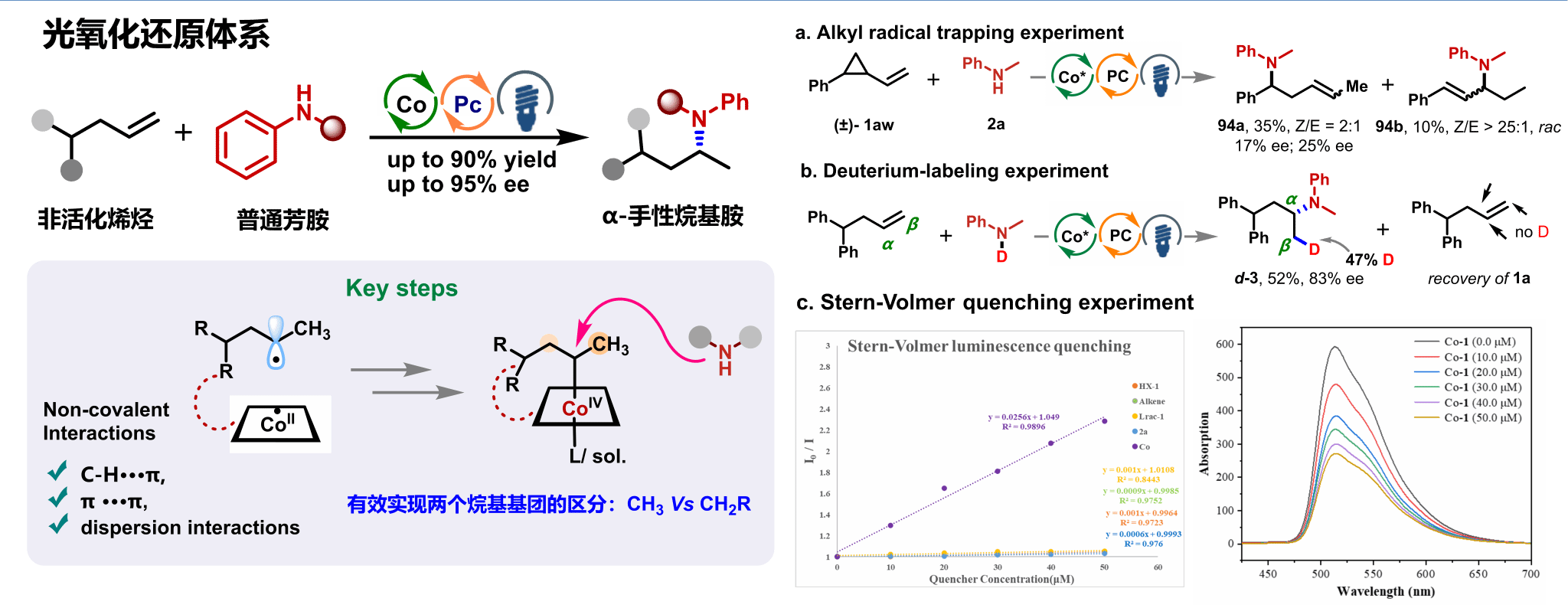 为了进一步实现极具挑战性的非活化烯烃的不对称自由基氢胺化反应,解决二烷基碳自由基立体化学控制的关键难题,研究团队创新性地融合了金属/光协同催化与自由基-极性交叉策略,提出光钴协同催化的“高价金属亲核取代”新机制。该过程利用手性催化剂与碳自由基之间的弱相互作用,精准识别并引导二烷基自由基形成C–M键,进而在温和的光氧化条件下生成关键的高价烷基钴中间体。光催化体系的引入,不仅避免了传统方法中化学计量氧化剂的使用,还通过还原生成的Co(I)析氢原位生成关键的Co(III)–H物种,从而无需外加计量氢源,显著提升了反应的原子经济性与可持续性。整个转化过程通过一个精巧的四步催化循环实现,完成了从原料到产物的高效、高立体选择性传递。该工作不仅成功拓展了不对称自由基反应的应用边界,使非稳定化烷基自由基的对映选择性控制成为可能,同时也为α-手性叔胺的合成建立了新平台,为探索开发其他亲核试剂在不对称自由基官能化中的应用提供了新设计思路与理论支撑。相关成果以“A Photo- and Cobalt-Catalyzed Enantioselective Hydroamination of Unactivated Alkenes with Amines” 为题,发表于国际权威期刊Angew. Chem. Int. Ed.(Hot Paper)。我校yl6776永利集团博士研究生苗焕然、张东亮以及青年教师祝丽涵(理论计算)为共同第一作者,张鸽副教授和张前教授为共同通讯作者。