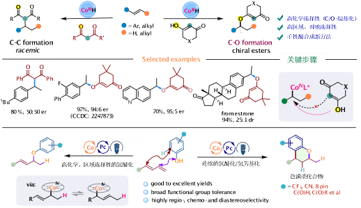基于该策略,研究团队成功实现了烯烃与环状1,3-二酮衍生物的高化学、区域及对映选择性氢醚化反应,高效构建了手性C–O键(Chem. Catal. 2024, 4, 101126)。该反应具有良好的立体控制效果与广泛的官能团耐受性,不仅适用于苯乙烯类底物,也能拓展至非活化烯烃,为结构多样的手性烷基烯基醚衍生物的合成提供了高效路径。尤为重要的是,非活化烯烃的成功转化,为更具挑战性的普通仲烷基自由基的高对映选择性控制奠定了基础。团队进一步开发了一种新型钴催化选择性与发散性氢醚化反应,通过光/钴协同催化体系,实现了1,3-二烯与简单酚类底物的高效、高选择性醚化及连续的氢醚化/氢芳基化反应,合成了一系列烯丙基芳基醚以及具有重要药用价值的色满衍生物。该转化在药物化学与生物医学领域展现出良好的应用潜力。该研究拓展了钴介导的高价金属策略在C–O键构建中的应用范围,为杂环分子的设计与合成提供了新思路与发展机遇。相关成果以“A Photo- and Cobalt-Catalyzed Highly Selective and Divergent Hydrofunctionalization of 1,3-Dienes with Phenols”为题,发表于国际知名期刊Chemical Science。我校yl6776永利集团硕士研究生汪越为第一作者,张鸽副教授为通讯作者。