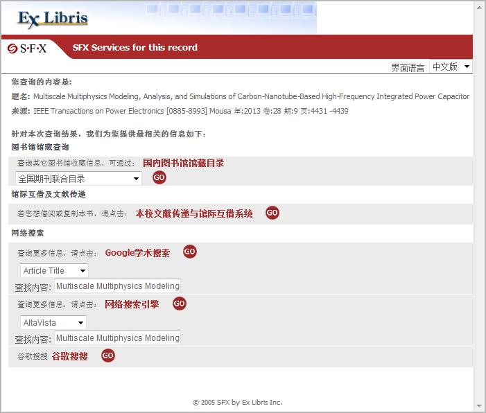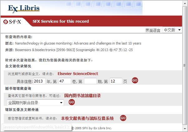 点击SFX链接图标跳转到图书馆SFX服务页面。