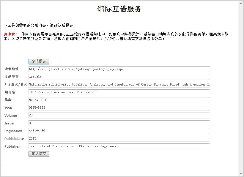 如图书馆未购买此文献的全文,呈现页面如图6所示。SFX系统仅显示此篇文章的信息,能够帮助读者采用其他方式如原文传递(如图7所示)等查找和获取全文。
