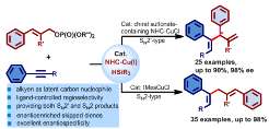 过渡金属催化的对映选择性烯丙基取代反应可在分子中引入重要的烯丙基官能团的同时构建立体中心,在有机合成、药物设计以及材料化学领域应用广泛。然而,该方法常用金属有机试剂(例如:格氏试剂、有机锂试剂、有机锌试剂或有机硼试剂)仍存在官能团兼容性差、制备步骤繁琐、稳定性差及不易储存等缺点。最近,该团队以现场产生催化量的金属有机中间体替代传统化学计量或超过化学计量的金属有机试剂,发展了首例直接以廉价、易得及稳定的炔烃为原料的对映选择性烯丙基化反应,该方法可以通过配体调控实现高化学、区域及对映选择性地获得支链型(SN2’)及线性(SN2)的目标产物(图二)。该研究工作由张前教授、熊涛副教授指导,2015级博士研究生徐国兴等同学共同完成,发表于化学权威期刊德国《应用化学》上(Ligand-Controlled Regiodivergent and Enantioselective Copper-Catalyzed Hydroallylation of Alkynes, Angew. Chem. Int. Ed. 2017, 56, 13130-13134).