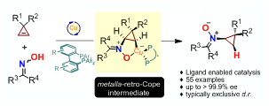 硝酮是一类极为重要的有机化合物,在生物医药、自由基化学、聚合物工业等领域有重要的直接应用价值,在有机合成领域被广泛用于构建各种重要的杂环化合物和天然产物。然而,目前催化合成硝酮的方法较少,且尚无高对映选择性的催化转化。近期永利官网有机化学学科的研究团队发展了Cu(I)催化的肟与环丙烯衍生物高对映选择性合成对映体富集的环丙基硝酮衍生物的新方法。作为肟的第一例分子间Cope-型氢胺化反应,该反应具有原料和催化剂廉价易得、原子经济性高等优势。同时,这一机理新颖的高效催化策略也提供了首例高对映选择性的硝酮形成方法,为手性硝酮的催化合成提供了广阔的前景 (图一)。该研究工作由张前教授、赵金钵副教授指导,2016级博士研究生李占宇等同学共同完成,发表于化学权威期刊《美国化学会志》上(Asymmetric Nitrone Synthesis via Ligand-Enabled Copper-CatalyzedCope-Type Hydroamination of Cyclopropene with Oxime, J. Am. Chem. Soc. 2017, 139, 11702-11705).