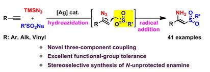 炔烃是基础的化学化工原料,炔烃的活化与转化研究一直是有机化学研究的核心内容之一。近日,yl6776永利集团有机功能分子设计与合成重点实验室毕锡和课题组在非活化端炔双官能化方向取得重要研究进展。自由基参与的炔烃双官能化反应是制备官能化烯烃的直接途径,一般来说,自由基物种首先进攻炔烃碳碳三键,生成烯基自由基中间体,然后再与其它物种偶联生成官能化烯。这一策略产生的烯基自由基中间体具有高度反应性,极为容易进行氢官能化反应,导致炔烃双官能化反应难于进行。该课题组通过在概念上创新,提出了反应序列可控的炔烃双官能化新策略和新思路,即:序列性氢叠氮化—自由基加成策略。基于这一策略,毕锡和课题组成功发展了非活化端炔的区域、立体选择性砜胺化反应,为beta-砜基烯胺类化合物合成提供了简便新方法。该反应具有反应条件温和、操作简便、底物范围宽泛等优点。该研究工作由毕锡和教授指导,2016级博士研究生宁永泉等同学共同完成,发表于《德国应用化学》(IF = 11.994)。