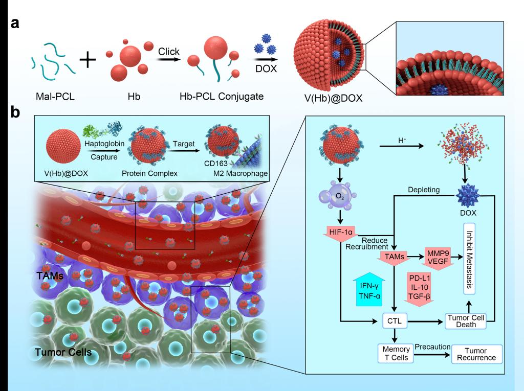 黄宇彬教授团队设计合成了一种血红蛋白-聚(ε-己内酯)(Hb-PCL)共轭聚合物并自组装成仿生纳米红血细胞(nano-RBC)系统(V(Hb)),利用血红蛋白能够与内源性血浆结合珠蛋白(Hp)自发结合并通过CD163表面受体特异性靶向M2型巨噬细胞的特点,使该输送系统V(Hb)@DOX能够实现对M2型TAMs的特异性靶向杀伤,并且血红蛋白的携氧功能能够改善肿瘤的乏氧微环境,从而对TIME进行重塑,实现高效的癌症化疗-免疫治疗联合治疗(下图)。