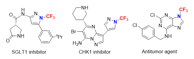 三氟甲基(CF3)作为一类重要的含氟有机官能团,能显著改变分子的理化性质(溶解度、亲脂性、构象、pKa和膜渗透性)、代谢稳定性和生物利用度,因此将其引入有机分子是调节生物活性分子性质的常用策略,近年来引起了研究者们极大的兴趣。研究表明,唑类杂环的N上键连CF3形成的N-CF3唑是药物化学中非常有价值的优势结构(图1)。然而,N-CF3唑类化合物尚未在药物研发中得到运用,主要原因是该类物质的合成极具挑战性,至今仍是合成化学及氟化学领域的研究难点。