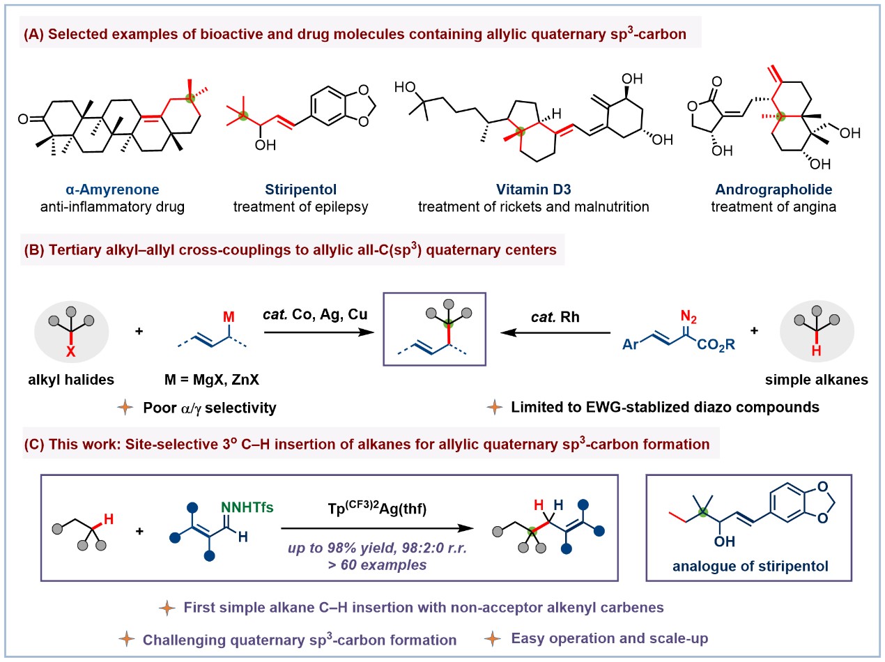 在前期工作基础上,该团队继续开发烯基-N-邻三氟甲基苯磺酰腙在有机合成中的应用,成功实现了供体烯基金属卡宾与烷烃三级碳氢键的选择性插入反应。该反应从大宗石化原料烷烃出发,高效地构建了含有季碳中心的烯丙基化合物,具有底物范围宽泛、官能团耐受性好、区域选择性高等优点。该方法能够用于克级规模合成,相应的烯丙基化产物可以进一步转化为多种合成上有用的化学品,包括治疗癫痫药物斯利潘托及其类似物。控制实验和密度泛函理论(DFT)研究揭示了反应机理以及位点、化学选择性的来源:首先,银催化剂作用下生成高亲电的烯基银卡宾;后者通过三元环状过渡态,以协同的方式插入到烷烃三级C−H键中。虽然三级C−H插入与产物环丙烷化能垒几乎一样,但是实验中使用了大过量的烷烃,因此反应主要生成烷烃烯丙基化产物。这一研究工作成功建立了合成烯丙基季碳化合物的简便方法,将进一步推动烯基金属卡宾在有机合成中的应用研究。